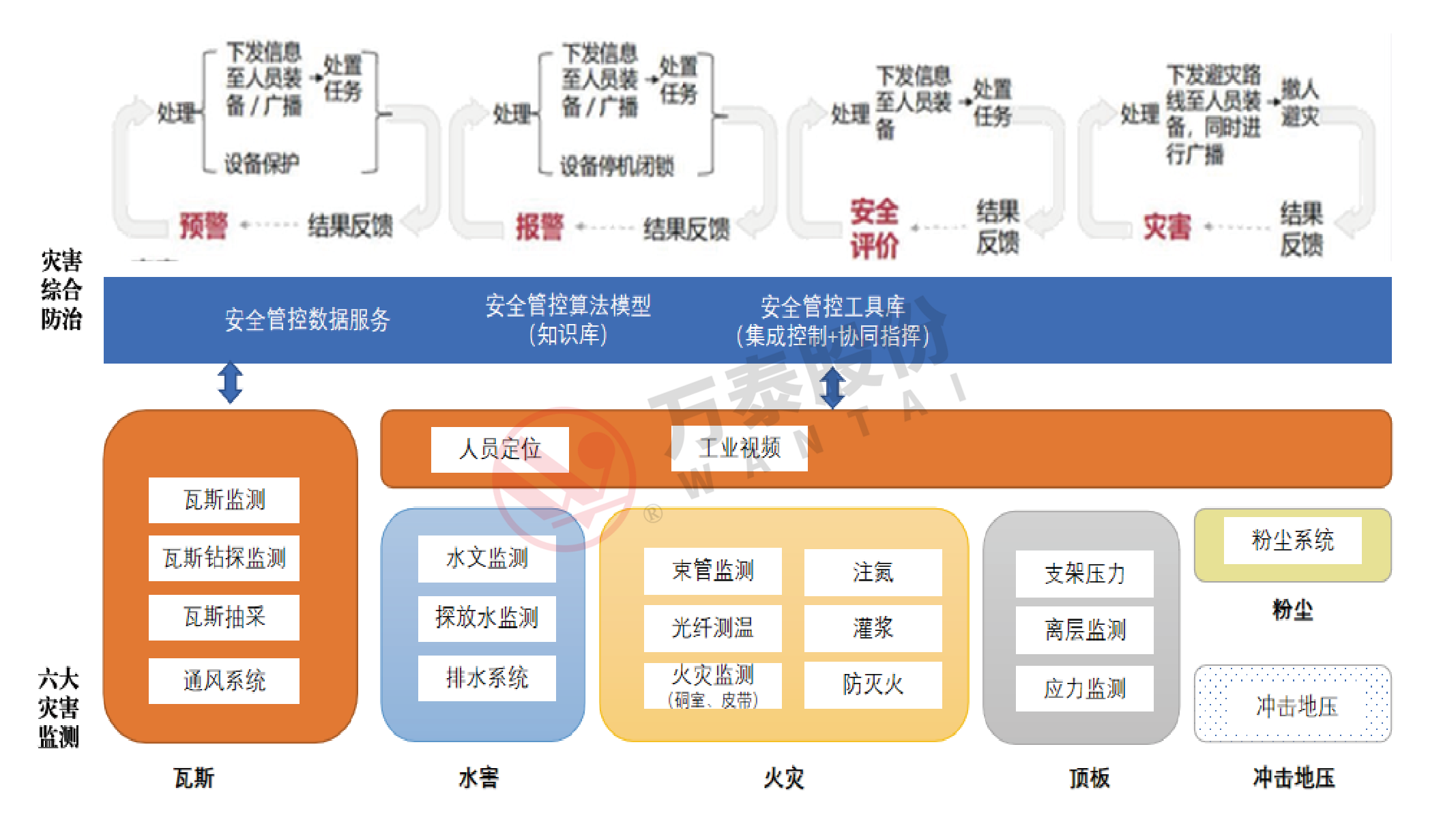 災(zāi)害綜合防治系統(tǒng)是通過對井下瓦斯、水害、火災(zāi)、粉塵、頂板、地壓等災(zāi)害監(jiān)測系統(tǒng)集成,綜合運用人工智能、大數(shù)據(jù)、物聯(lián)網(wǎng)、云計算、移動互聯(lián)、機器學習、三維仿真建模等技術(shù)手段,緊緊圍繞著煤礦安全管理,融合礦井“人、機、環(huán)、管”多系統(tǒng)、跨業(yè)務(wù)監(jiān)測監(jiān)控數(shù)據(jù),基于多源異構(gòu)數(shù)據(jù)統(tǒng)一集成規(guī)范、多系統(tǒng)融合聯(lián)動技術(shù)、災(zāi)害成因機理和大數(shù)據(jù)分析技術(shù),構(gòu)建智能災(zāi)害綜合防治系統(tǒng),實現(xiàn)煤礦瓦斯、水、火、頂板、粉塵等災(zāi)害信息的監(jiān)測預警和災(zāi)害模擬仿真,為災(zāi)害超前治理和源頭管控提供依據(jù),提升礦井災(zāi)害防治水平,實現(xiàn)礦井災(zāi)害智能化防控。