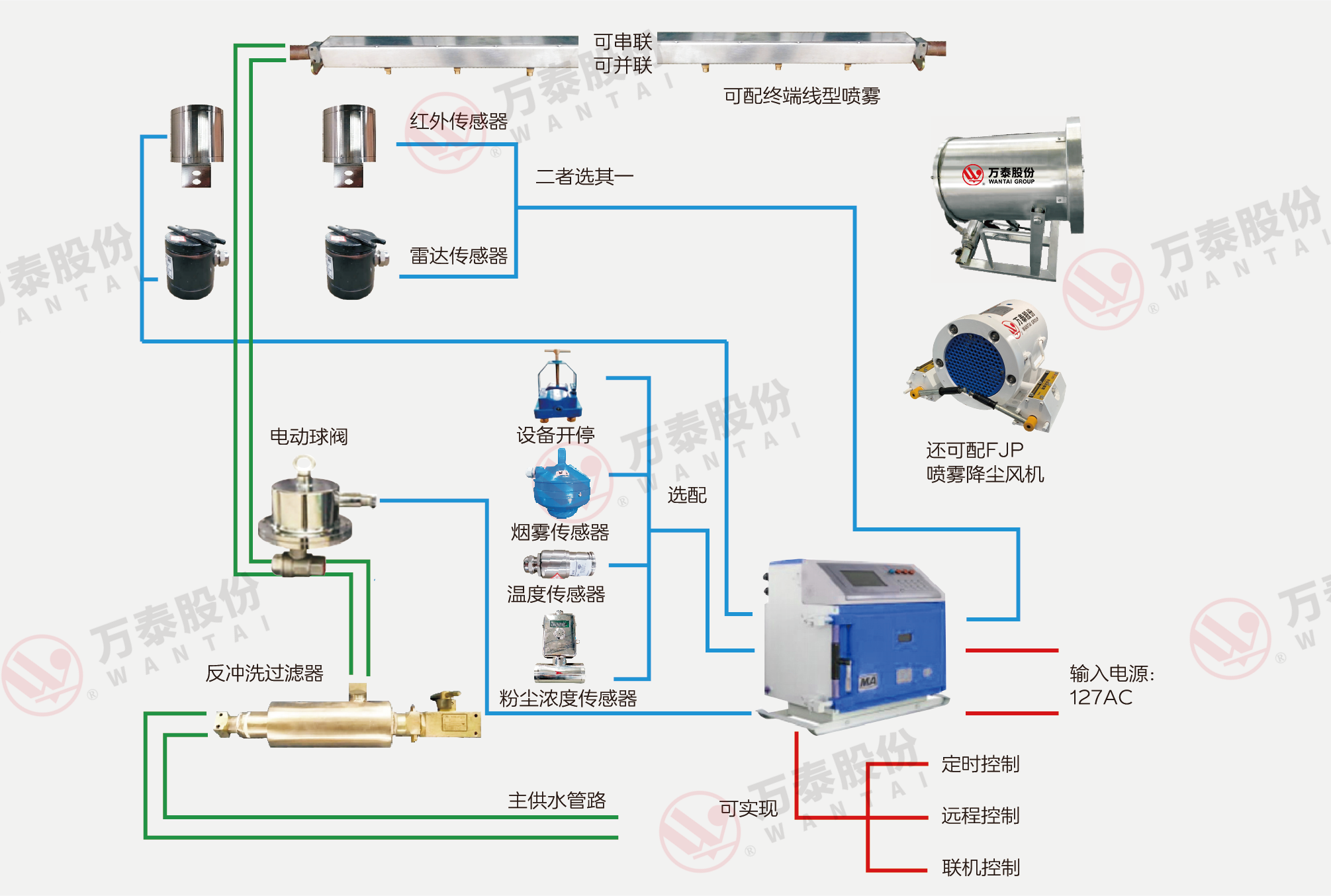 3.本系統(tǒng)還可選配粉塵濃度傳感器、溫度傳感器、瓦斯?jié)舛葌鞲衅鳌⒏袘?yīng)傳感器等多種傳感器,實(shí)現(xiàn)定時(shí)控制、遠(yuǎn)程控制、聯(lián)機(jī)控制等多種控制方式。