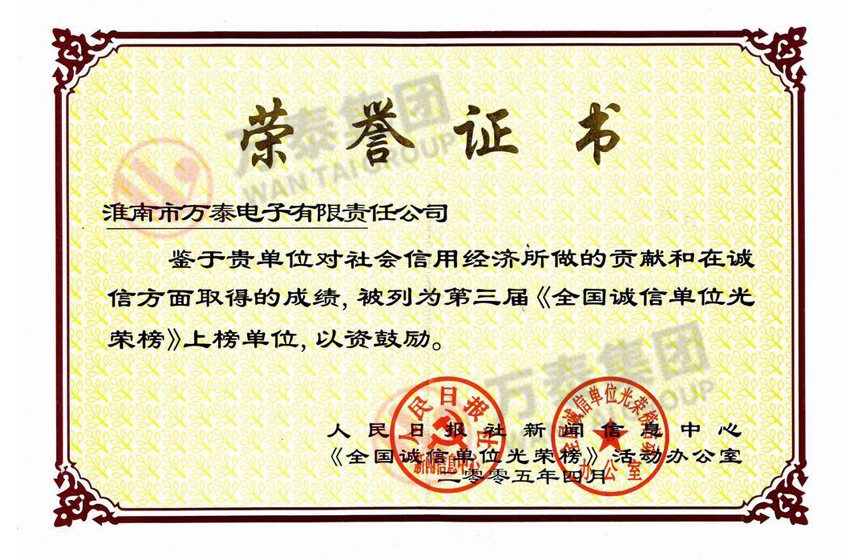• 《全國(guó)誠(chéng)信單位光榮榜》上榜單位