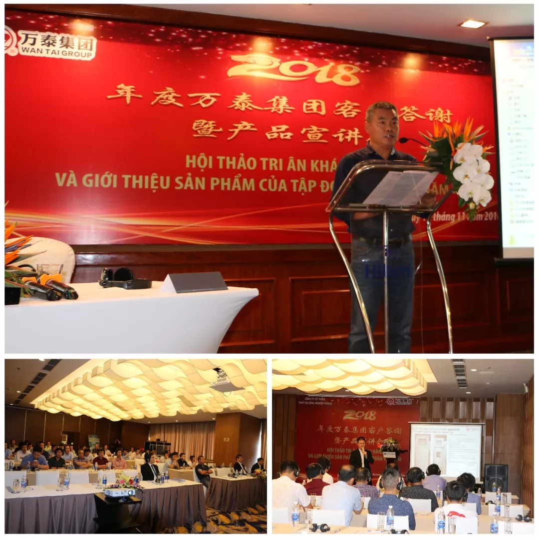 11月,萬泰集團余子先董事長攜下屬公司領(lǐng)導分別在越南河內(nèi)、廣寧召開2018年產(chǎn)品宣講會,深度推廣萬泰產(chǎn)品技術(shù)和品牌,深化合作關(guān)系。